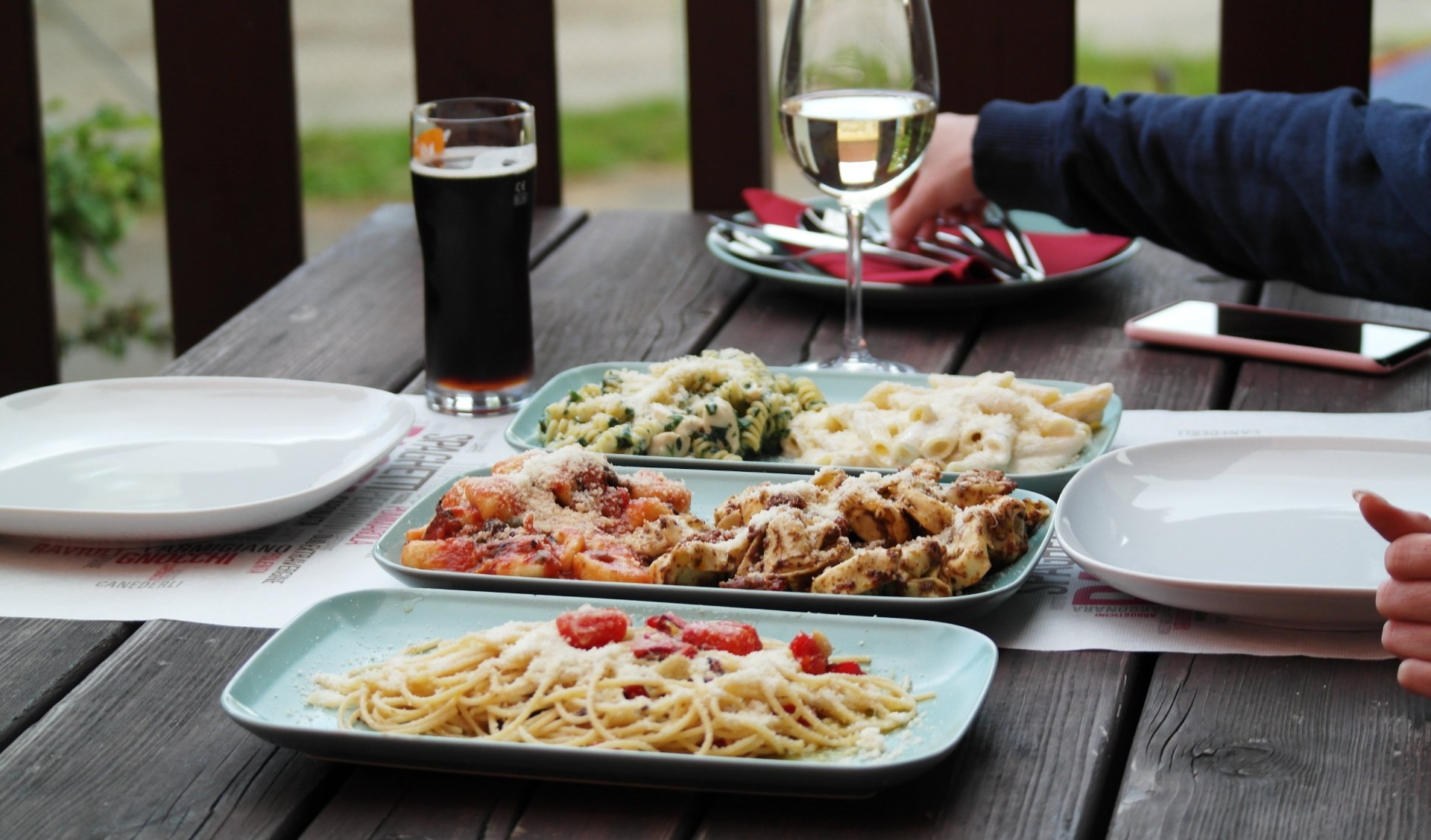 Tagliatelle s lososem, cherry rajčátky, bílým vínem, česnekem, olivovým olejem a petrželkou